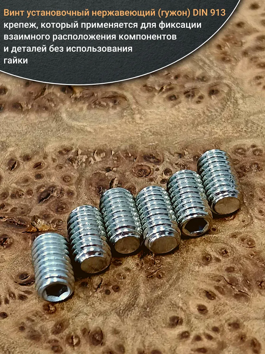 Винт DIN 913 - винт установочный с полной метрической резьбой, с внутренним шестигранником под ключ. Конец установочного винта имеет специальную форму, служащую для фиксации изделий относительно друг друга. Винт DIN 913 используется для соединения элементов конструкций в машиностроении, приборостроении и прочих промышленно-производственных отраслях для фиксации деталей и элементов машин и устройств (где нет возможности применить болт с головкой) совместно с гайками, шайбами соответствующих размеров. В качестве материала для установочных винтов используют высокопрочные сорта стали с твердостью не ниже 45H, нержавеющую стать А1, А2, А4, иногда полиамид. Стальные болты могут быть покрыты цинком для улучшения их эксплуатационных характеристик.