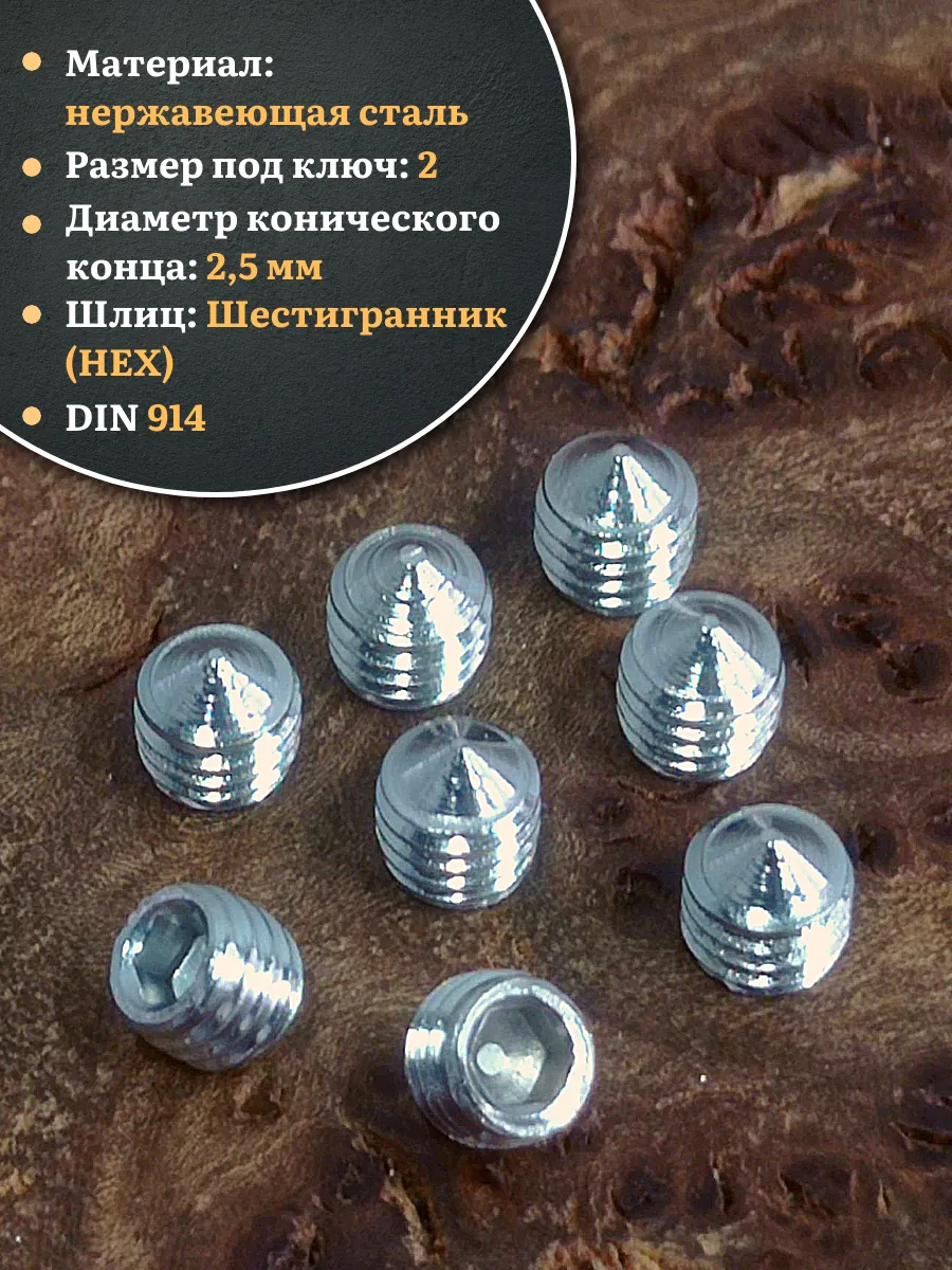 DIN 914 - винт установочный с полной метрической резьбой, с острым концом используется для соединения элементов конструкций в машиностроении, приборостроении и прочих промышленно-производственных отраслях совместно с гайками, шайбами соответствующих размеров. Производится из углеродистой стали, нержавеющей стали А2 и А4, латуни. Его можно отличить по отсутствию головки, где шлиц (углубление под плоскую отвертку или шестигранник) находится непосредственно в торце. Корпус крепежа полностью выполнен в виде резьбы и, проходя через гнездо в детали, упирается в него на всю свою длину, что повышает надежность сцепления. Нажимной кончик также бывает различной формы, может быть выполнен из разных материалов (например, нейлона) и предназначен для повышения устойчивости фиксации.