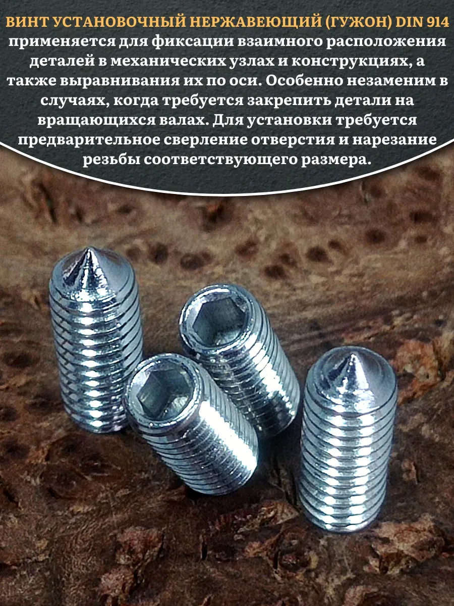 DIN 914 - винт установочный с полной метрической резьбой, с острым концом используется для соединения элементов конструкций в машиностроении, приборостроении и прочих промышленно-производственных отраслях совместно с гайками, шайбами соответствующих размеров. Производится из углеродистой стали, нержавеющей стали А2 и А4, латуни. Его можно отличить по отсутствию головки, где шлиц (углубление под плоскую отвертку или шестигранник) находится непосредственно в торце. Корпус крепежа полностью выполнен в виде резьбы и, проходя через гнездо в детали, упирается в него на всю свою длину, что повышает надежность сцепления. Нажимной кончик также бывает различной формы, может быть выполнен из разных материалов (например, нейлона) и предназначен для повышения устойчивости фиксации.