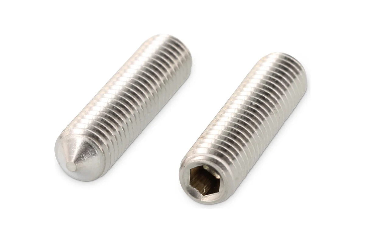 DIN 914 - винт установочный с полной метрической резьбой, с острым концом используется для соединения элементов конструкций в машиностроении, приборостроении и прочих промышленно-производственных отраслях совместно с гайками, шайбами соответствующих размеров. Производится из углеродистой стали, нержавеющей стали А2 и А4, латуни. Его можно отличить по отсутствию головки, где шлиц (углубление под плоскую отвертку или шестигранник) находится непосредственно в торце. Корпус крепежа полностью выполнен в виде резьбы и, проходя через гнездо в детали, упирается в него на всю свою длину, что повышает надежность сцепления. Нажимной кончик также бывает различной формы, может быть выполнен из разных материалов (например, нейлона) и предназначен для повышения устойчивости фиксации.
