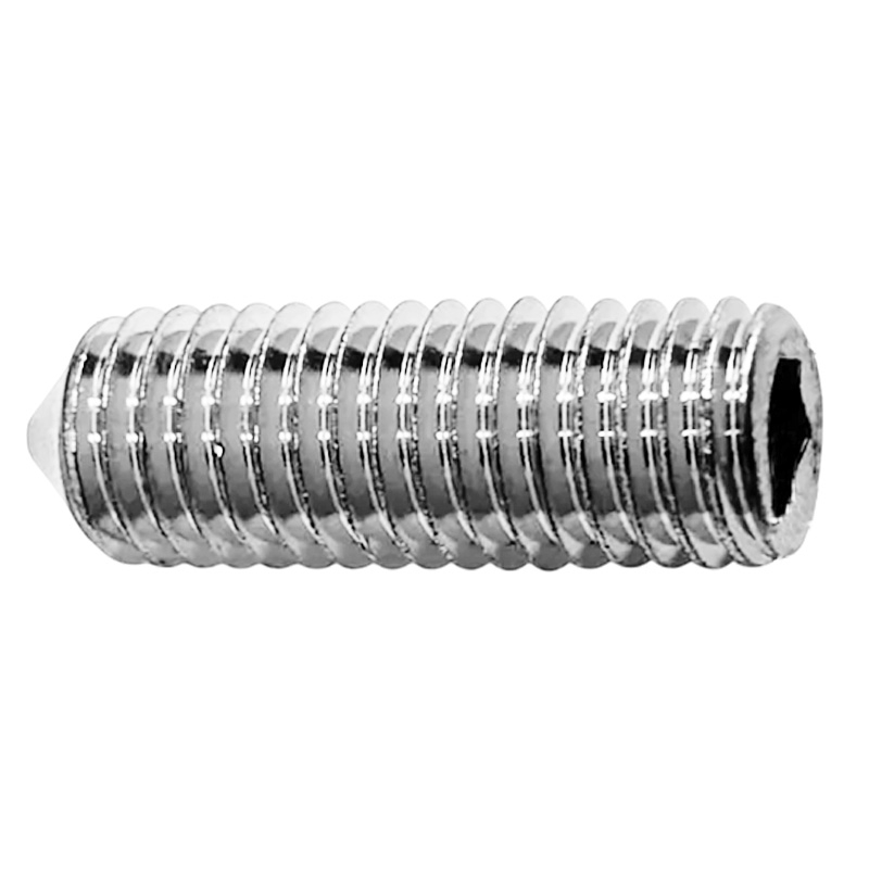 DIN 914 - винт установочный с полной метрической резьбой, с острым концом используется для соединения элементов конструкций в машиностроении, приборостроении и прочих промышленно-производственных отраслях совместно с гайками, шайбами соответствующих размеров. Производится из углеродистой стали, нержавеющей стали А2 и А4, латуни. Его можно отличить по отсутствию головки, где шлиц (углубление под плоскую отвертку или шестигранник) находится непосредственно в торце. Корпус крепежа полностью выполнен в виде резьбы и, проходя через гнездо в детали, упирается в него на всю свою длину, что повышает надежность сцепления. Нажимной кончик также бывает различной формы, может быть выполнен из разных материалов (например, нейлона) и предназначен для повышения устойчивости фиксации.