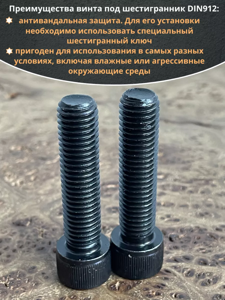 Винт имеет высокую цилиндрическую головку, предназначен для установки его с углублением в отверстие. Закручивается винт при помощи ключа-шестигранника. Высокопрочный винт DIN 912 обеспечивает надежное скрепление узлов и деталей в монтажных и других видах работ. Он имеет головку цилиндрической формы с углублением под соответствующий шестигранный ключ.