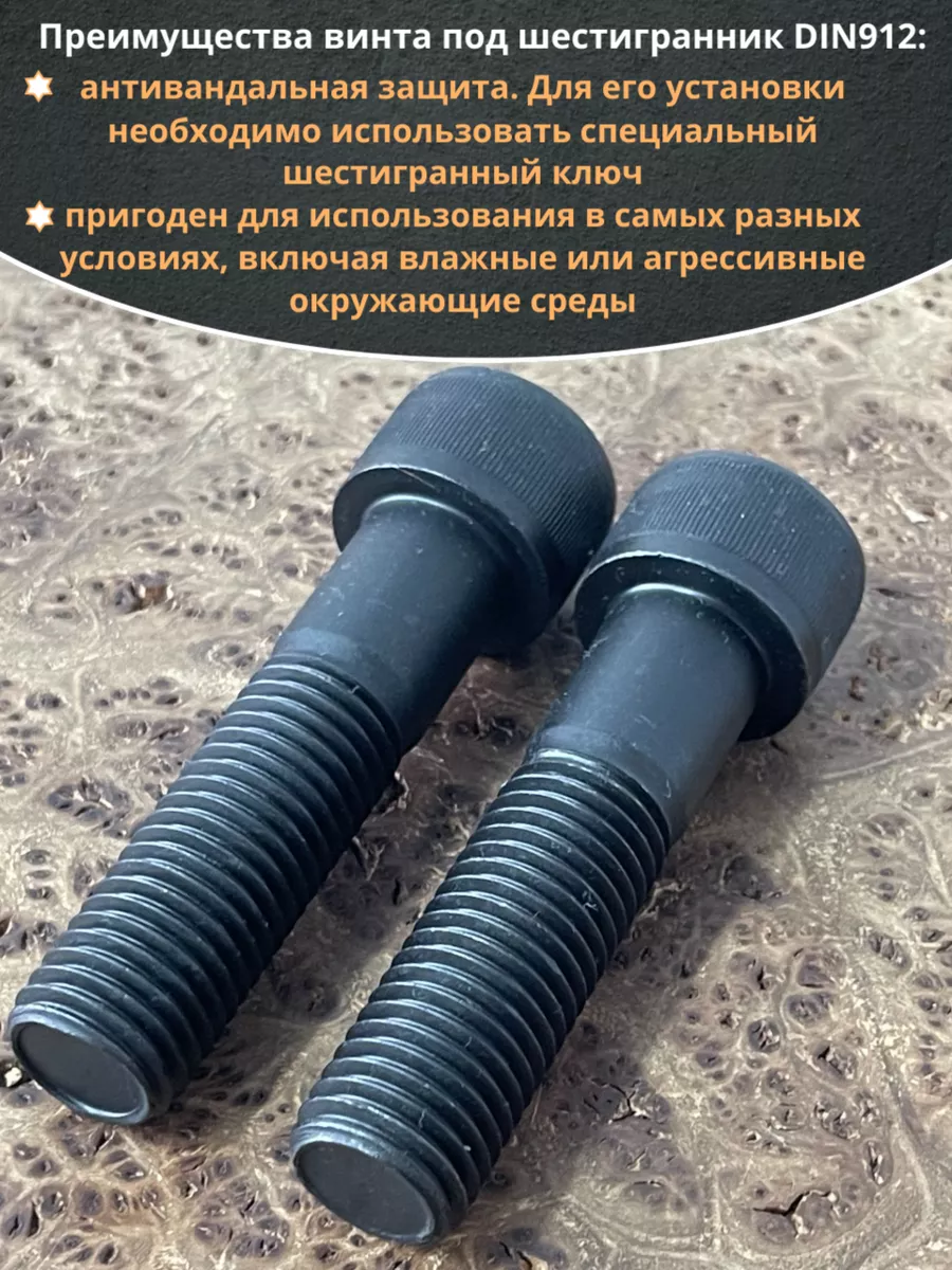 Винт имеет высокую цилиндрическую головку, предназначен для установки его с углублением в отверстие. Закручивается винт при помощи ключа-шестигранника. Высокопрочный винт DIN 912 обеспечивает надежное скрепление узлов и деталей в монтажных и других видах работ. Он имеет головку цилиндрической формы с углублением под соответствующий шестигранный ключ.