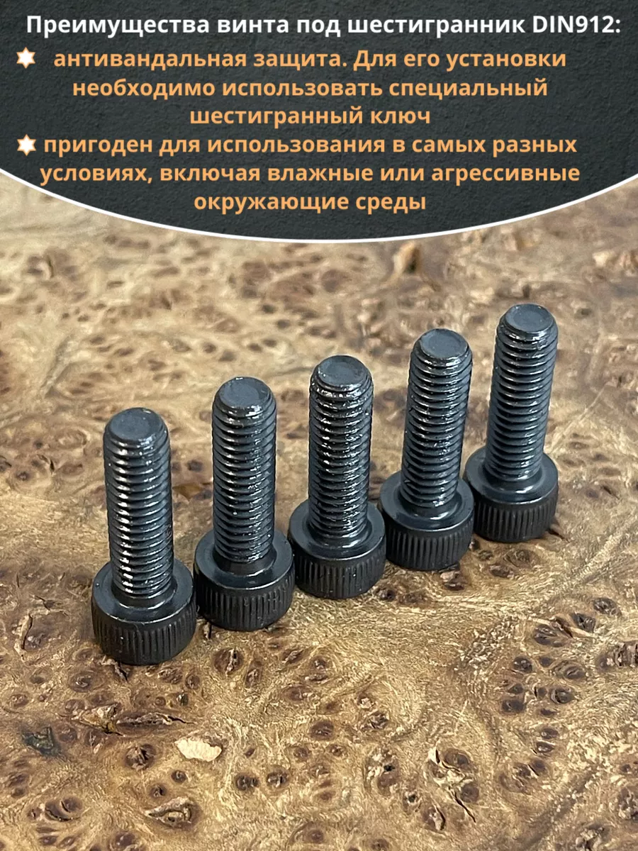 Винт имеет высокую цилиндрическую головку, предназначен для установки его с углублением в отверстие. Закручивается винт при помощи ключа-шестигранника. Высокопрочный винт DIN 912 обеспечивает надежное скрепление узлов и деталей в монтажных и других видах работ. Он имеет головку цилиндрической формы с углублением под соответствующий шестигранный ключ.
