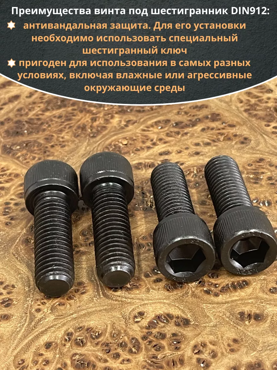 Винт имеет высокую цилиндрическую головку, предназначен для установки его с углублением в отверстие. Закручивается винт при помощи ключа-шестигранника. Высокопрочный винт DIN 912 обеспечивает надежное скрепление узлов и деталей в монтажных и других видах работ. Он имеет головку цилиндрической формы с углублением под соответствующий шестигранный ключ.