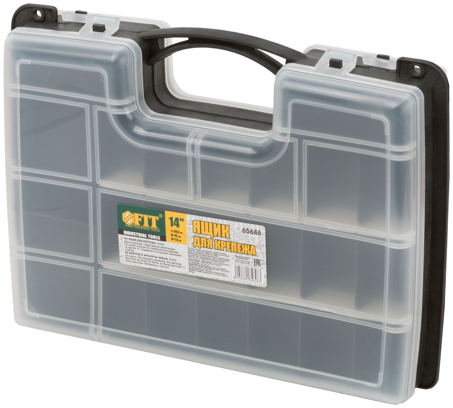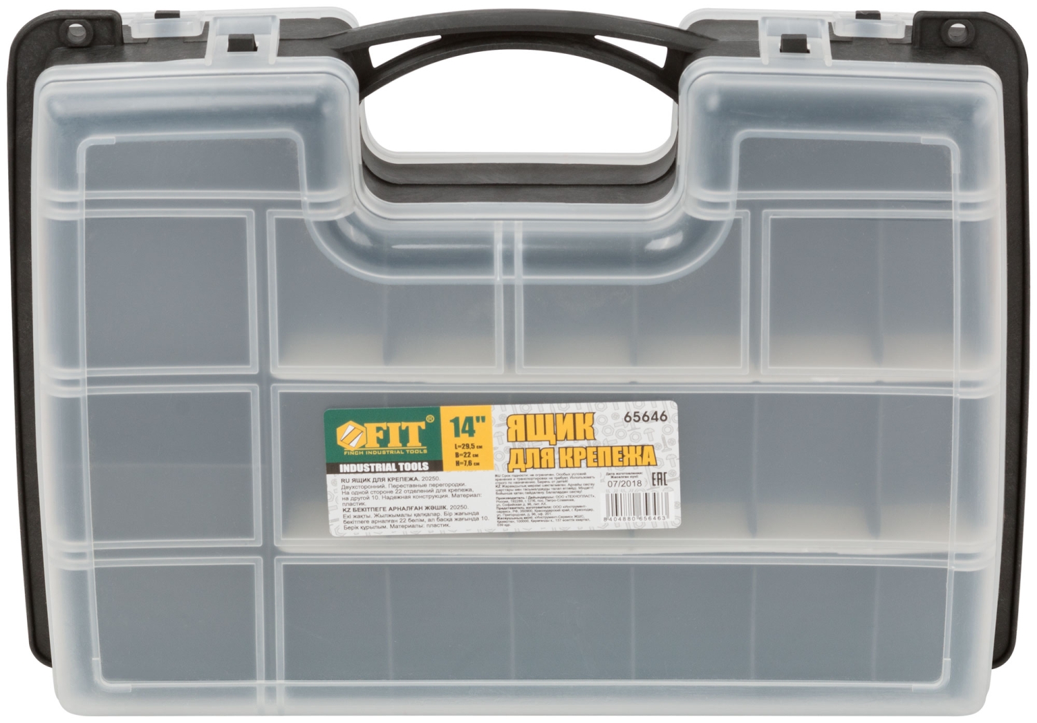 Пластиковый. Двухсторонний. Переставные перегородки. На одной стороне 22 отделений для крепежа, на другой 10.