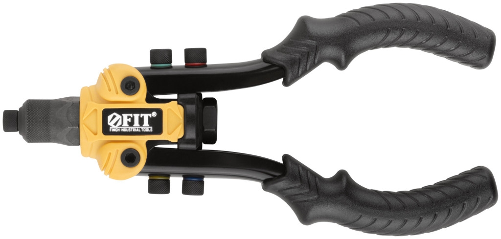 Профи. Двуручный, компактный. Для крепления вытяжных заклепок из алюминия, стали и нержавеющей стали. Рычажно-складной механизм для создания высокого усилия при работе. 5 быстросъемных насадок. Материал: корпус из инструментальной стали и нейлона, трехкулачковый механизм захвата заклепок из хром-молибденовой стали, рукоятки и насадки из инструментальной стали, ПВХ накладки на рукоятках. Упаковка: картонная коробка.